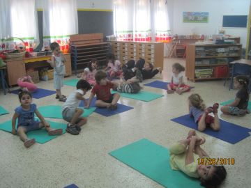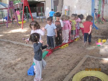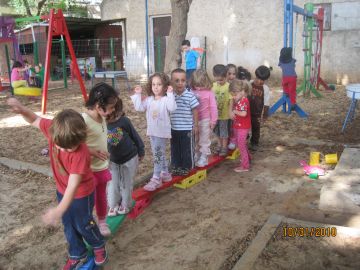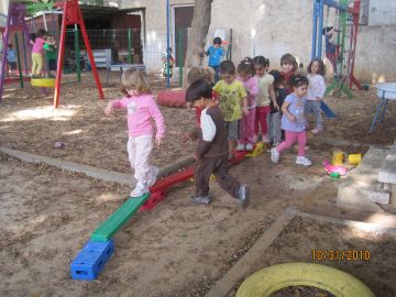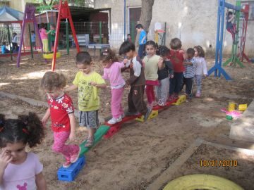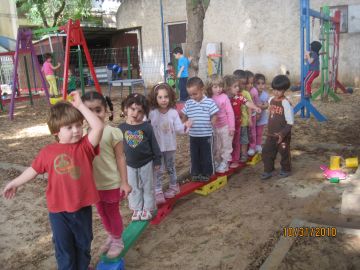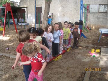 בינתיים לא מזניחים את המוטוריקה הגסה ומתאמנים גם בחצר בהליכה על קורה :
